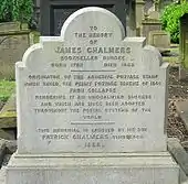 His son, Patrick Chalmers (born Dundee, 26 July 1819 – died Wimbledon, Surrey, 3 October 1891), wrote many articles that attempted to evince his father's share in the work of postal reform and as inventor of the adhesive postage stamp.[1] His book Robert Wallace MP and James Chalmers, the Scottish Postal Reformers was published in 1890. Patrick Chalmers's daughter, Leah Chalmers, wrote a book How the adhesive postage stamp was born which was published in 1939. In 1971 a further book was published about James Chalmers "James Chalmers Inventor of the adhesive postage stamp". The co-author William J Smith was a director of David Winter & Sons Ltd (successor to the James Chalmers printing company). Charles Chalmers had succeeded his father James in the printing business in 1853. Charles took David Winter into partnership in 1868 and left him the business on his death in 1872. The printing company was renamed to David Winter & Son.[2] All these books claim that James Chalmers first produced an essay for a stamp in August 1834 but no evidence for this is provided in any of the books.