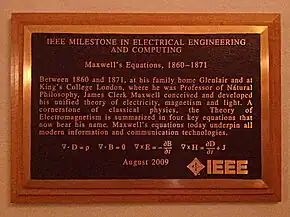 Commemoration of Maxwell's equations at King's College. Two identical IEEE Milestone Plaques are at Maxwell's birthplace in Edinburgh and the family home at Glenlair.[75]