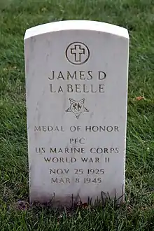 Private First Class James Dennis La Belle (November 22, 1925 – March 8, 1945) enlisted in the United States Marine Corps Reserve on November 18, 1943. Fifteen months later, in his first and last battle, he heroically sacrificed his life at Iwo Jima and was posthumously awarded the Medal of Honor, the highest military honor awarded by the United States.