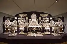 The complete work consists of 180 objects, many of them inscribed with quotes from the Book of Revelation. The centerpiece of the exhibit is a throne, seven feet tall, built on the foundation of an old maroon-cushioned armchair with the words "Fear Not" at its crest. The throne is flanked by dozens of altars, crowns, lecterns, tablets and winged pulpits. Wall plaques on the left bear the name of apostles and those on the right list various biblical patriarchs and prophets such as Abraham and Ezekiel.[7] The text The Throne of the Third Heaven of the Nations' Millennium General Assembly was written on the objects in Hampton's handwriting.