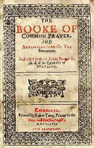 It is an incident on Sunday 23 July 1637 which places Hannay into the national understanding of the history of the Scottish Church. He was equipped with a new Edinburgh publishing by the King's official printer, Robert Young, fresh off the press: the Scottish Book of Common Prayer.[5] This had been commissioned by Archbishop Laud, the Archbishop of Canterbury. Whilst modern eyes (or ears) might not appreciate the fury this incited, the core issue was the book (whilst being a "Scottish" version) was still intrinsically English. The service began with three prayers led by Rev Patrick Henderson from the uncontroversial Book of Common Order. As he finished he said he did not think he would be reading ever again. Hannay then took the Scottish Book of Common Prayer to the pulpit (at around 10am). The use of an English rather than Scottish liturgy was offensive, and had also sidestepped the control of the presbyteries. Many also saw it as a move back to the Catholic mass. Bishop Lindsay was close to Hannay in his pulpit when the reading sparked a widespread riot in the church. The Bishop of St Andrews and Bishop of Dunblane were also present.[6] Infamously Jenny Geddes stood up and threw her stool at Hannay's head. Bishop Lindsay had moved to the pulpit to quell the crowd but was pulled out by a Mrs Main. The service had to be terminated. The demonstrators (most of the congregation) were ejected, but remained outside. This incident was a precursor to the National Covenant of 1638.[3]