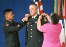 Lieutenant General James R. Helmly (center), chief of the Army Reserve, has his three-star rank pinned on by Army Chief of Staff General Eric K. Shinseki and Maria Helmly, May 29, 2002, at the Pentagon.