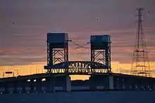 The James River Bridge (JRB) is a four-lane divided highway lift bridge across the James River in the Commonwealth of Virginia. Owned and operated by the Virginia Department of Transportation, it carries U.S. Route 17 (US 17), US 258, and State Route 32 across the river near its mouth at Hampton Roads. The bridge connects Newport News on the Virginia Peninsula with Isle of Wight County in the South Hampton Roads region, and is the easternmost such crossing without a tunnel component.