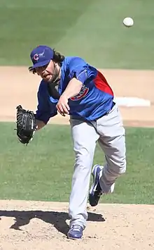 In 2010, Russell also helped extend Texas' streak of having a former player debut in the major leagues from eight consecutive seasons to nine.[3] He made 20 appearances for the Cubs, going 0–1 with a 4.20 ERA before being optioned to Triple-A Iowa on June 12.[18] However, after making just five appearances for Iowa, Russell was recalled by the Cubs on June 29, after Carlos Zambrano was placed on the restricted list and John Grabow went on the disabled list.[19] He finished the season with a 1–1 record, a 4.96 ERA, and a 1.347 WHIP in 57 appearances for the Cubs.[20] Following the season, the Chicago Tribune stated that the inclusion of Russell and three other inexperienced relievers in the Cubs' bullpen was one of the team's 10 biggest mistakes of the season.[21]