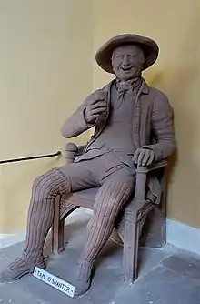 While engaged upon a monument in Crosbie churchyard, near Monkton, in 1827, he attracted the attention of David Auld, a hairdresser in Ayr. Encouraged by Auld, he carved a bust of Burns from a portrait — a copy of the portrait by Alexander Nasmyth — which hung in the Burns Monument at Alloway. It confirmed Auld's opinion of Thom's ability, and induced him to advise the sculptor to attempt something more ambitious. It was decided to create statues of Tam O'Shanter and Souter Johnnie, characters from Burns's poem Tam o' Shanter; Thom, who resided with Auld, set to work on the life-size figures, which were hewn direct from the stone without a preliminary sketch. William Brown, tenant of Trabboch Mill, served as model for Tam; no one could be induced to sit for the Souter, whose face and figure were surreptitiously studied from two cobblers in the neighbourhood of Ayr.[1]