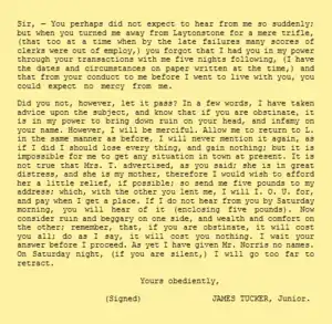 Tucker was convicted at the Chelmsford Spring Assizes on 3 March 1826 of blackmailing his cousin, James Stanyford Tucker. He was tried before Sir William Alexander, C.B., "On an indictment for sending a threatening letter...accus[ing] of an infamous crime" and sentenced to transportation for life. He was 18 years old at the time. The next year he was put aboard the convict ship Midas, which sailed for Sydney Cove.[3] He arrived in Sydney in 1827 and worked at Emu Plains, New South Wales. Still a convict, he was sent to Port Macquarie in 1844. He was in Goulburn from 1849 to 1853.[4]