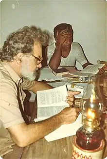 ![]() Gair and W. S. Karunatillake working by lamplight at Karunatillake's home in Kelaniya, c. 1984/5 | |