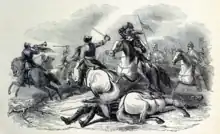 It was at this critical juncture that Lawrie of Blackwood paid him a second visit, not to assist, but to discourage him, by proposing a second time that he should disband his followers and trust to an indemnity, which he assured him the Duke of Hamilton would exert himself to obtain for them. As he had no credentials to show, and seemed to be speaking merely his own sentiments without the authority of either party, Blackwood's proposal excited suspicions of his motives. He, however, remained with the party, which had now moved on to Collington, all night; and in the morning was the bearer of a letter from Colonel Wallace to General Dalzell, who sent it to the council, while he hastened himself to pursue the insurgents. Wallace in the meantime marched to Ingliston Bridge, at the point of the Pentland Hills, and was in the act of drawing up his little party to prevent straggling when he learned that Dalzell, with the advance of the king's troops, was within half a mile of him. There had been a heavy fall of snow through the night, but it was succeeded by a clear frosty day; and it was about noon of that day, the 28 of November, when the armies came in sight of each other. That of the insurgents did not exceed 900 men, ill-armed, worn out with fatigue, and half starving. The royal army, which amounted to upwards of 3000 men, was in the highest order, and well provided in all respects. Wallace disposed his little army upon the side of a hill running from north to south. The Galloway gentlemen, on horseback, under M'Clellan of Barmagachan, were stationed on the south; the remainder of the horse, under Major Learmont, on the north; and the foot, who were exceedingly ill armed, in the middle. Dalzell seems to have been for some time at a loss how to proceed; having such a superiority, however, in numbers, he detached a party of horse, under General Drummond, to the westward, in order to turn Wallace's left wing. This detachment was met by the Galloway gentlemen, under Captain Arnot and Barmagachan, and completely routed in an instant; and had Wallace been in a condition to have supported and followed up this masterly movement, the king's army would inevitably have lost the day. A second attack was met by Major Learmont with equal spirit; and it was not till after sunset, when Dalzell himself charged the feeble unarmed centre with the strength of his army, horse and foot, that any impression was made upon them. This charge they were unable to resist, but were instantly broken and dispersed. The nature of the ground, and the darkness of the night, favoured their flight, and there were not more than 100 of them killed and taken by the victors; but they were in an unfriendly part of the country, and many of the fugitives were murdered by their countrymen.[14]