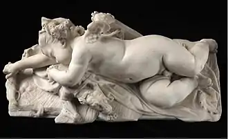 He known for his allegorical representations of children. An example are a pair of terracotta figures representing Air and Fire. The Africa boy stands for the element Fire because of the association of black people with the heat of the African sun.[17] The statues may also be allegorical representations of the continents Europe and Africa. They were likely created as workshop models for larger stone and marble compositions. These terracotta models appealed as individual works of art and were collected by contemporary collectors.[18] Among his allegorical representations of children are a few busts and statues of African boys, such as the African boy with a crown in the form of a fortress (1704, Rijksmuseum in Amsterdam),[19] the marble Bust of a black boy (1705–10, Victoria and Albert Museum)[14] and the bronze Bust of an African Boy (Walters Museum). There have also been a number of similar busts attributed to de Cock sold on the art market. These busts may have been based on a particular individual but were also intended to represent a general type of the African[20] The African boys typically wear on their chest a medallion, showing a portrait or a symbol. These were likely connected with the particular preference of the patron for whom the sculpture was produced. For instance, the medallion on the bust in the Victoria and Albert Museum represents a cardinal's hat. This suggests that the boy represented a cleric's page and that the bust was likely commissioned by a cardinal.[21]