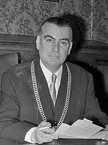 Jan Johannis Adriaan Berger (18 September 1918 – 6 September 1978) was a Dutch politician.[1] During WWII he hid people who were supposed to be shipped off to Germany as forced labourers.[1] In 1946 he became a member of the Labour Party.[1] On 15 July 1952 he became a member of the lower house.[1] As member of the lower house he represented his party in matters of social security.[1] He spent much effort on the creation and passing of the Algemene Ouderdomswet.[1] The minister of social security and health care even proposed to name the bill after Berger but he refused as he feared this would alienate its Christian supporters.[1][2] On 21 September 1954 Berger left the lower house.[1] On 20 March 1959 Berger returned to the lower house, he also was a member of the party leadership in this period.[1] He was approached for the position of parliamentary leader but refused the job.[1] From on 1961 Berger represented the interest of the North Netherlands.[1][3] On 3 July 1962 he became a member for the states-provincial, representing Groningen, he was immediately made parliamentary leader.[1] On 1 June 1965 Berger became mayor of Groningen.[1][4] On 11 May 1971 he became a member of the lower house for the third and final time, this time for DS’70,[4] permanently leaving on 1 April 1975.[1][4] He died on 6 September 1978.[1]