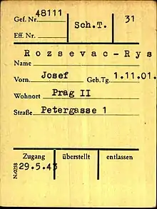 Rys-Rozsévač attempted to establish a mass fascist organization and helped to move Vlajka from traditional anti-German chauvinism to collaboration with Nazis and Gestapo. During 1939 - 1940 Vlajka organized mass meetings against politicians of the First Republic of Czechoslovakia as represented by Masaryk and Beneš. The German occupational authorities nevertheless decided to support a group of collaborators around Emanuel Moravec, his political competitor. Because of constant propaganda attacks on Moravec, Vlajka was disbanded at the end of 1942 and the leaders, including Rys-Rozsévač, were sent as privileged prisoners into the Dachau concentration camp and transferred to Tyrol at the end of the war, where he was liberated in early May 1945.[1] After the war Rys-Rozsévač and three his coworkers (Josef Burda, Jaroslav Čermák and Otakar Polívka) were sentenced to death, and several others to were sentenced to long term imprisonment. Rys-Rozsévač was hanged in Pankrác Prison in 1946.