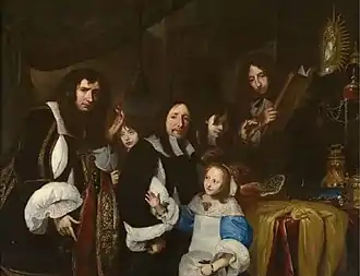 Jan de Herdt also was aware of trends in Central European painting. This is shown in his Portrait of the family of Imperial Goldsmith Franz Wilhelm de Harde von Antorff. De Herdt's family portrait likely includes a self-portrait in the young man on the left who holds a watch in his left hand and points with his right hand to the floor. Alternatively, this may be a portrait of his nephew. Given the similarities between the two works, de Herdt's family portrait may indicate that he had seen the Family of precious stone cutter Dionysius Miseroni (National Gallery Prague) painted by the Czech portrait painter Karel Škréta in 1653. This was one of the first group portraits of this kind in Central Europe. In 1669 Tobias Pock painted a Self-Portrait with the artist's family in which he depicted himself in a manner that is almost identical to the one used by Jan de Herdt in his family portrait. Pock may have known de Herdt's family portrait. Jan de Herdt along with the above-mentioned artists created an entirely new visual language in Central Europe through this type of communicative group portrait.[8]