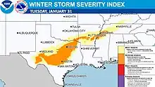 ![]() GOES-16 satellite image of the storm impacting the South Central United States at 17:36 UTC (11:36 a.m. CST) on January 31 | |