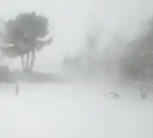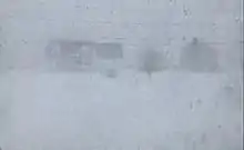 The blizzard deposited 24.2 inches (61 cm) in Boston from late Friday night until Saturday late afternoon, making it the seventh-largest snowstorm for Boston, behind storms in 2003, 1978, 1969, 1997, 2013, and 2015.[77] The 23.6 inches (60 cm) of snow the city received on Saturday, January 29 tied its all-time one-day snowfall record first set on February 17, 2003.[40][78] Snow was falling at rates of between 2 and 4 inches (5.1 and 10.2 centimetres) an hour, and was being blown by winds up to 70 mph (110 km/h) resulting in blizzard and near zero visibility conditions for most of Eastern Massachusetts, including Cape Cod, for most of Saturday's daylight hours.[79][80][71] Massachusetts banned heavy trucks from state highways.[60] Commuter rail into Boston had significant delays and cancellations throughout the day, a number of bus routes' service was suspended due to poor visibility (with about 30 buses getting stuck in heavy snow), and service on two surface sections of two subway lines was replaced with buses.[81] Approximately 91% of arrivals and departures, 617 flights in total, were cancelled at Boston's Logan Airport on January 29.[82] Many flights for the morning of January 30 were also cancelled.[61] Boston ran buses on some segments of its subway lines on January 30 and during the evening of January 31 to enable full clearing of snow from subway tracks.[7][83]