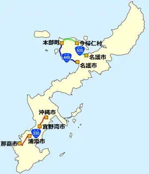 National Route 449 is a national highway of Japan connecting Motobu, Okinawa and Nago, Okinawa in Japan, with a total length of 20.3 km (12.61 mi).