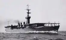 Hōshō was laid down by the Asano Shipbuilding Company in Tsurumi-ku, Yokohama, on 16 December 1920. She was launched on 13 November 1921 and towed to Yokosuka Naval Arsenal for completion on 10 January 1922. Hōshō was delayed by repeated design changes and late deliveries of equipment, pushing the commissioning date from March to 27 December 1922. She was commissioned lacking much of her aviation equipment, and did not begin landing trials until 22 February 1923.[19] The first landings were made by British pilots under contract, who were quickly replaced by Japanese pilots trained by the British Aviation Mission.[20] After Hōshō was commissioned, experienced aircrews requested changes, and the ship was modified by the shipyard from 6 June to 20 August 1924. The island, tripod mast, and aircraft crane were removed since they partially obstructed the flight deck and obscured pilot visibility. The forward part of the flight deck was made horizontal, and the 8 cm AA guns were moved forward, close to the position of the former island and out of the way of landing operations.[21] Another reason for removal of the island was that the IJN found that it was too small and cramped to be of effective use in controlling air operations or conning the ship.[3] After the island was removed, the carrier's flight operations were controlled from a platform extending from the side of the flight deck, a design that would be repeated in subsequent Japanese aircraft carriers.[22] The ship was then assigned to the 1st Fleet until 15 November 1924.[21]