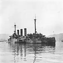 At the start of the Russo-Japanese War, Yakumo was assigned to the 2nd Division of the 2nd Fleet.[17] She participated in the Battle of Port Arthur on 9 February 1904, when Vice Admiral Tōgō Heihachirō led the Combined Fleet in an attack on the Russian ships of the Pacific Squadron anchored just outside Port Arthur. Tōgō had expected the surprise night attack by his destroyers to be much more successful than it was, anticipating that the Russians would be badly disorganized and weakened, but they had recovered from their surprise and were ready for his attack. The Japanese ships were spotted by the protected cruiser Boyarin, which was patrolling offshore and alerted the Russians. Tōgō chose to attack the Russian coastal defenses with his main armament and engage the ships with his secondary guns. Splitting his fire proved to be a poor decision as the Japanese eight- and six-inch guns inflicted little damage on the Russian ships, which concentrated all their fire on the Japanese ships with some effect.[18] Although many ships on both sides were hit, Russian casualties numbered some 150, while the Japanese suffered roughly 90 killed and wounded before Tōgō disengaged.[19] Yakumo was not hit during the engagement, although she did hit the protected cruiser Novik one time with an eight-inch shell.[20]