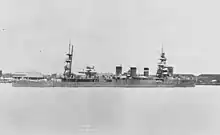 Yura, named after the Yura River,[11] was laid down on 21 May 1921 at the Sasebo Naval Arsenal, launched on 15 February 1922 and completed on 20 March 1923.[12] The ship became the flagship of the 5th Cruiser Squadron (Sendai) which included her sister ships Nagara, Natori, and Kinu on 1 April. Together with 2nd Destroyer Squadron, the 5th Squadron patrolled Chinese waters between 25 August and 4 September. The squadron, now consisting of Yura, Nagara and Natori, was assigned to the Second Fleet on 1 December. Reinforced by the light cruiser Sendai in May, the division made a cruise to Hahajima Island in October 1924. On 1 December, Yura became a private ship in the 5th Squadron which patrolled Chinese waters off the Yangtze River delta, Qingdao (Tsingtao) and Dalian (Dairen) from 25 March to 23 April 1925. The squadron made another cruise off Qindao beginning on 29 March 1926, but Yura returned to Sasebo on 1 April.[13] She was commanded by Captain Soemu Toyoda from November 1926 to November 1927[14] and became flagship of Submarine Squadron 1 on 1 December. Two weeks later, the ship began trials with a Yokosuka E1Y2 floatplane and led her squadron on a patrol off Qindao from 26–27 March to 16 April 1927 together with the Third Cruiser Squadron. Yura was reduced to reserve at Sasebo on 1 December 1927.[15]