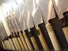 A Japanese kitchen knife is a type of a knife used for food preparation. These knives come in many different varieties and are often made using traditional Japanese blacksmithing techniques. They can be made from stainless steel, or hagane, which is the same kind of steel used to make Japanese swords.[1] Most knives are referred to as hōchō (Japanese: 包丁/庖丁) or the variation -bōchō in compound words (because of rendaku) but can have other names including -kiri (〜切り, lit. "-cutter"). There are four general categories used to distinguish the Japanese knife designs: handle (Western vs. Japanese), blade grind (single bevel vs. double bevel), steel (stainless vs. carbon), and construction (laminated vs. monosteel).