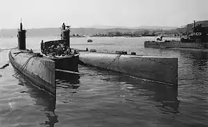 Ha-109 was in Saeki Bay at Matsuura, Japan, when hostilities between Japan and the Allies ended on 15 August 1945.[4] Upon receiving the news that day, her crew destroyed her secret documents and distributed some of the food and fuel on board to local fishermen.[4] In late August 1945, she proceeded from Saeki Bay to Kure, Japan, her crew throwing all of her ammunition and the torpedoes in her hold overboard during the voyage.[4] Only a skeleton crew consisting of her commanding officer and seven crewmen remained aboard after her arrival at Kure on 24 August 1945.[4] She surrendered to the Allies at Kure on 2 September 1945.[4]