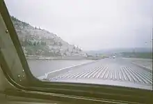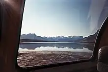 The Canadian National Railway skirts the northern shore of the lake. Parts of its mainline have been built on causeways away from the shore, which have created several mini lakes. Via Rail's passenger train the Canadian uses this same CN line as part of its journey from Toronto to Vancouver, giving train passengers up-close views of the lake, sand dunes, and surrounding mountains. This area has been the site of many CN publicity photographs—including of the Super Continental[3][4]—through the years, and it is still popular with photographers, railfans, the present-day Canadian and its advertisers and passengers.