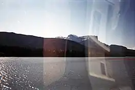 ![]() Jasper Lake and mountains across the shore as seen from the train | |