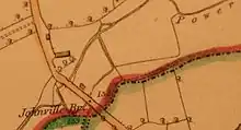 The bridge still retains the original name of Johnville Bridge on all Ordnance Survey Ireland maps but is also unusual in design. This is because in close proximity to the Powerstown River, a branch tributary diverts water from the main stream closer to Johnville House before reconnecting with the Powerstown River. So the bridge is actually a set of two; one double arched bridge over the Powerstown River, and a single arched bridge over the tributary stream with the roadway being raised above the ground but still walled in on both sides. On the up-river side of the tributary there is a water filled depression known as the "watering hole" where a seasonal river joins onto the divert before flowing under the single arch section.