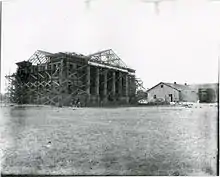 View of the east and north faces of the present Jeff Davis County Courthouse during construction between 1910-1911. To the right is the original courthouse no longer extant.