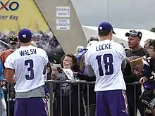 Locke signing autographs at the Vikings' training camp in 2014 with placekicker Blair Walsh.
