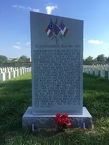 A monument entitled Memorial to the Confederate Dead was placed in Jefferson Barracks on May 1, 1988[4] It is located in section 66 of the cemetery. Not to be confused with the removed Memorial to the Confederate Dead (St. Louis).