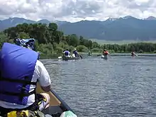 The Jefferson River is rated as Class I water for recreational purposes from its origin at the Beaverhead and Big Hole rivers to its confluence with the Missouri at Three Forks.[16] The river is suitable for floaters and beginning paddlers, except during high water flows in the spring. Possible hazards include downed trees, called "sweeps" and diversion dams constructed to channel river water into irrigation ditches. Water levels often drop off by mid-summer, making it necessary to drag watercraft over shallow riffles.[17]
