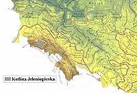 The valley is characterised by ridges which are separated by smaller basins. Wzgórza Karpnickie near Karpniki is the easternmost ridge, followed by Obniżenie Mysłakowickie basin near Mysłakowice to the west, Wzgórza Łomnickie ridge to the southeast of Cieplice Śląskie-Zdrój (a spa district of Jelenia Góra), the wide basin Obniżenie Sobieszowa near Sobieszów, Wysoczyzna Rybnicy ridge north west of Piechowice and Starej Kamienicy basin near Stara Kamienica.