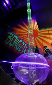 The bong was a classic design of a shaft and a bubble. The glassblowers added uranium to the glass to produce a bright green glow.[11]