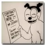 Jerry the Troublesome Tyke was first produced in 1925 by animator Sid Griffiths and photographer Bert Bilby who both worked as projectionists at Cardiff's Capitol Cinema.[1] They were later joined by London-based co-animator Brian White.[2] Inspired by the American animation Felix the Cat, Jerry the Tyke was a mixture of live-action sequences and animation, similar in style to Max Fleischer's Out of the Inkwell series.[1][3][4] 40 animations were created between 1925 and 1927, and were shown throughout the World as part of Pathé Pictorial, a fortnightly cinema news-magazine.[5] Each silent short lasted for about four minutes and often featured Griffiths interacting with Jerry, though Jerry always remained on the drawn page.[6]