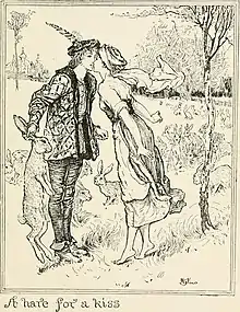 Then he was set to herd a hundred hares. Using the whistle, he kept them together. The king heard of it and resolved to stop him. A shabby girl begged for a hare to feed for guests; finally, Jesper agreed to give her one in return for a kiss, but then he whistled it back. A stout old woman, in peasant dress, came next. He agreed to give her one if she would tiptoe about him cackling like a hen, and then he whistled it back. A fat old man in a royal groom's livery came, and Jesper agreed to give him one if he stood on his head, and then whistled it back.