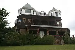 The Jesse Moore House is located northeast of downtown Worcester, in the Bell Hill neighborhood. It occupies a lot at the northwest corner of Catherine and Windsor Streets, where it is set up on a rise, with a granite retaining wall at the sidewalk. It is a 2+1⁄2-story structure, with the asymmetrical style and massing typical of the Queen Anne style. It has two three-story octagonal towers on its southern facade, along with a shingled porch. The second level has a recessed porch area between the two towers. Its ground floor is finished in rock-faced granite, while the upper levels are finished in wooden clapboards and shingles. Portions of the front and sides are decorated with colored terra cotta tiles.[2]