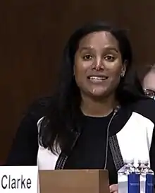 On December 15, 2021, President Joe Biden nominated Clarke to serve as a United States district judge of the United States District Court for the Southern District of New York to a seat vacated by Judge Colleen McMahon, who assumed senior status on April 21, 2021.[4] On January 12, 2022, a hearing on her nomination was held before the Senate Judiciary Committee.[5] During her hearing, Republican senators questioned her over her role in an investigation related to the New York City police response to George Floyd protests. James recommended that New York City decriminalize minor infractions to reduce "negative contact with the police, particularly in communities of color."[6] On February 10, 2022, the committee failed to report her nomination by an 11–11 vote.[7][8] On June 23, 2022, the United States Senate discharged the committee from further consideration of her nomination by a 50–49 vote.[9]