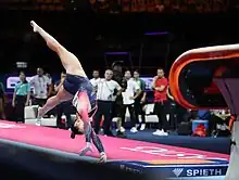 In September Gadirova was selected to represent Great Britain at the 2023 World Championships alongside Kinsella, Achampong, Fenton, and Ruby Evans.[48] She helped the British team to second place in qualifications as well as qualifying to the individual all-around, vault, beam and floor finals.[49] But in the team final, where Gadirova contributed on all four events, the team were unable to reach the same level as they did in qualifications and finished sixth as a team.[50] On the day of the individual all-around event, British Gymnastics in a surprise announcement said that Gadirova had withdrawn from the all-around competition as a "precautionary measure" after she felt some pain during training and was replaced by teammate Alice Kinsella.[51] On 15 October, Gadirova posted on her Instagram account that her withdrawal from the individual all-around was because she had suffered a full tear of her anterior cruciate ligament in which she described as a "freak accident" whilst performing a gymnastics prep skill in training.[52]