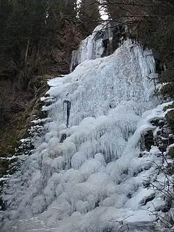 A waterfall in a gully in the mountains surrounding Jeti-Ögüz, frozen in the late fall