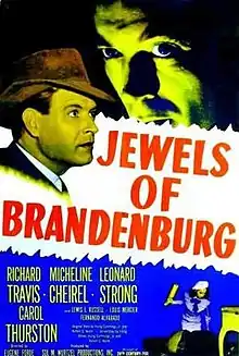Jewels of Brandenburg is a 1947 American crime film directed by Eugene Forde and written by Irving Cummings Jr. and Robert G. North. The film stars Richard Travis, Micheline Cheirel, Leonard Strong, Carol Thurston, Lewis Russell and Louis Mercier. The film was released on May 27, 1947, by 20th Century Fox.[1][2][3]