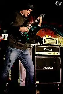 Tasikas is the primary songwriter and performs a number of different roles in Contrarian. These include complex guitar parts, keyboards and occasional lead guitar. He shares guitar duties with Brian Mason, playing mainly technical rhythm sections.[6][7][8][9] Tasikas is also known for his extensive guitar collection which has been featured in Decibel Magazine.[10][11][12][13] As of September 2020, Tasikas has been endorsed by ESP guitars and primarily uses their M Series guitars.[14][15][16][17]