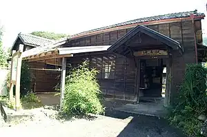 The station has a single island platform connected to a small wooden station building by a level crossing. The station is staffed.