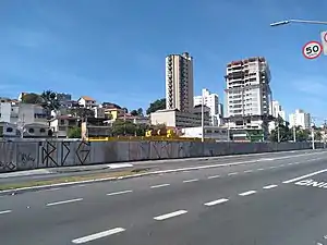 The construction of the station began in 2016, when the opening date was estimated to mid-2020.[2] Later, Governor Geraldo Alckmin promised the opening of the first phase of the line to 2020, time which was discarded due to a year of delay in the financing of the Federal Savings Bank, which would be used for the expropriations. In June 2016, the opening of the line was estimated for 2021,[3] time kept in October 2017, when the resume of the construction was announced for the beginning of 2018.[4][5][6] Currently, the construction is suspended, due to the involvement of the construction companies of the Move São Paulo consortium (Odebrecht, Queiroz Galvão, UTC Participações) in Operation Car Wash, which caused them to not get the financing of R$ 5.5 billions (US$ 1,575,344,427.58) with the Brazilian Development Bank (BNDES) for the continuity of the construction. The State Government of São Paulo is currently in negotiations with international companies, including Spanish Acciona[7] and Chinese China Railway Construction Corporation.[8]