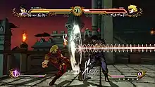 Attacking and receiving damage fills up a player's Heart Heat Gauge (ハートヒートゲージ, Hāto Hīto Gēji) which, when filled to either one or two levels, allows players to perform powerful Heart Heat Attacks (ハートヒートアタック, Hāto Hīto Attakku, HHA) or Great Heat Attacks (グレートヒートアタック, Gurēto Hīto Attaku, GHA), depending on how much their gauge is filled and which multiple button input is chosen. Players can decrease their opponent's Heart Heat Gauge by using taunts when they are knocked down. Players can also use Flash Cancels[lower-greek 1] to deplete their own Heart Heat Gauge to cancel their current combo attack and chain into a new one.[4] The Heart Heat Gauge is also used in some Battle Styles and certain special techniques. Rush Mode (ラッシュモード, Rasshu Mōdo), similar to the "Blazing Fists Match" system of Capcom's 1998 fighting game based on the series, occurs when two "Rush" attacks collide with each other, beginning a button mashing minigame. When a character's Stamina is low, the character enters one of two modes to turn the tide of the match: Rumble Mode (ゴゴゴモード, Gogogo Mōdo), which increases the character's attack strength and Heart Heat Gauge restoration, and Resolve Mode (覚悟モード, Kakugo Mōdo), which in addition to the bonuses from Rumble Mode adds a temporary invincible armor as well. Novice players can use the Easy Beat (イージービート, Ījī Bīto) system, which allows them to more easily string together combos and techniques by using only a single button. Along with the stamina gauge, players also have a Guard Gauge (ガードゲージ, Gādo Gēji) which depletes when they block attacks, causing them to become vulnerable if it is completely drained in a Guard Crush (ガードクラッシュ, Gādo Kurasshu). The Guard Gauge is also depleted by Stylish Evades,[lower-greek 2] special dodges that when executed properly make the character perform one of their iconic poses from the manga. The remaster adds three new mechanics; Assist Attacks, in which players can summon another character for an attack, Air Dash, which lets fighters dash in the air, and Stylish Guard, which lets players dodge attacks at the last second.[5]