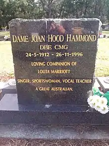 She died in 1996 in Bowral, New South Wales, aged 84, and was buried in the Bowral General Cemetery. Her long-time partner, Lolita Marriott, had pre-deceased her in 1993.[11] Cheryl Barker, Joan Carden and John Bolton-Wood sang at Hammond's memorial concert at the Melbourne Concert Hall, broadcast on ABC Classic FM.[16]