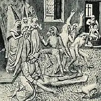 At the age of fifteen, Joan was present at the infamous Bal des Ardents given by Queen Isabeau, wife of the Duke of Berry's nephew King Charles, on 28 January 1393. During this, the King and five nobles dressed up as wildmen, clad "in costumes of linen cloth sewn onto their bodies and soaked in resinous wax or pitch to hold a covering of frazzled hemp," and proceeded to dance about chained together. At length, the King became separated from the others, and made his way to the Duchess, who jokingly refused to let him wander off again until he told her his name. When Charles' brother, Louis of Orléans, accidentally set the other dancers on fire, Joan swathed the King in her skirts, protecting him from the flames and saving his life.[5]