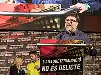 Nuet was re-elected at the 2017 regional election.[73][74] In October 2018 Nuet, Elisenda Alamany and others critical of the Catalunya en Comú leadership's lack of support for Catalan sovereigntism formed the Sobiranistes platform.[75][76][77] In March 2019 Communists of Catalonia voted to include Nuet on the secessionist Republican Left of Catalonia's (ERC) list of candidates for the 2019 general election.[78][79] As a result, he was expelled from the Catalunya en Comú parliamentary group.[80][81] On 18 March 2019 Nuet announced that he was resigning from the Parliament of Catalonia, leaving Catalunya en Comú and that he and the Sobiranistes would align themselves with ERC.[82][83]