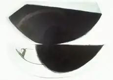 In the early 1990s, Pousette-Dart's perceptions of the space and light of the American Southwest inspired her to abandon painting within a rectangular format.[25] Her first exhibition of this work (Tenri Gallery, 1995) featured delicately balanced diptychs of irregular curved and angular shaped canvasses that interlock like puzzle pieces.[42][43] Untitled, Dark Edge diptych (1993–6, Museum of Fine Arts, Boston) is a representative and transitional work of this period, featuring two curved-side-down hemispheres, thickly painted grounds and Japanese calligraphy-like gesture.[25][44]
