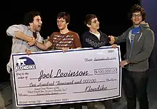 Levinson receives a giant promotional check from the Lonely Island