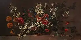 A few still lifes by him are known. A flower still life painting of Flowers in a porcelain bowl dated 1721 was sold at Bonhams. It represents flowers in a bowl placed on a stone plinth.[10] A similar painting dated 1728, which was an overdoor piece, was sold by Christie’s.[11] These still lifes are painted with a broad brush and less detail than the paintings in the National Maritime Museum.[2]